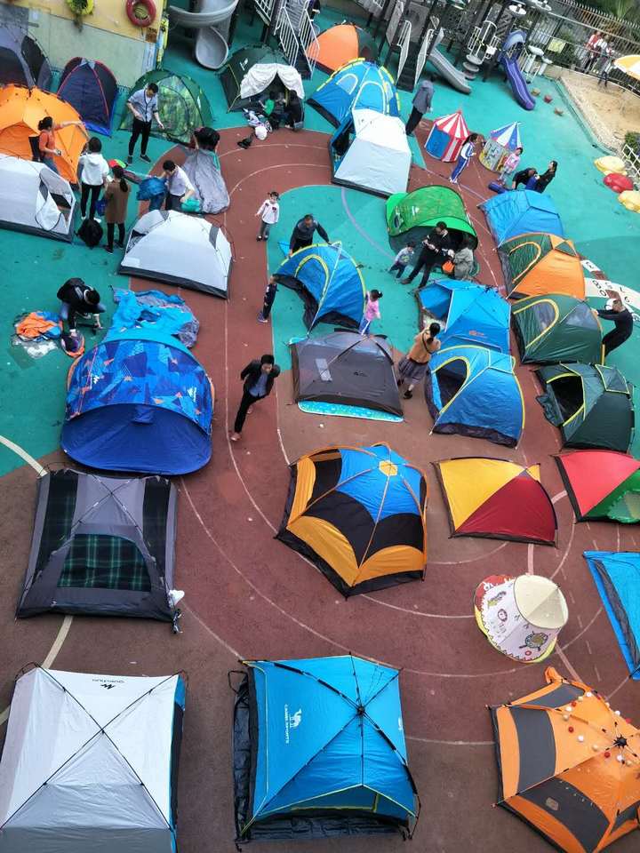 下午4點00分左右,家長們陸陸續(xù)續(xù)帶著自家的帳篷來到幼兒園,迫不及待地開始互相交談如何搭建,如何安置,他們更勝孩子般地期待著今晚親子閱讀的開始。