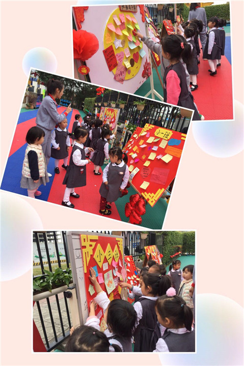 祝福小朋友新的一年好運連連,家長和幼兒在祝福板上寫下新年祝福。