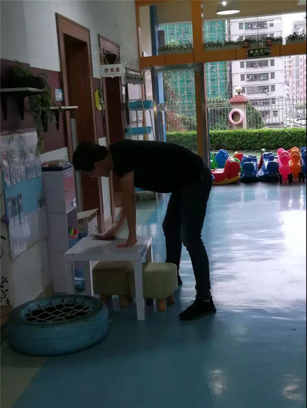 看,兩位爸爸參與消毒工作多認真仔細。