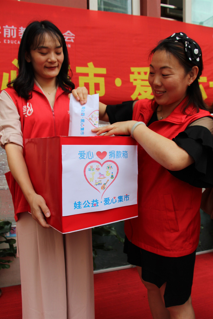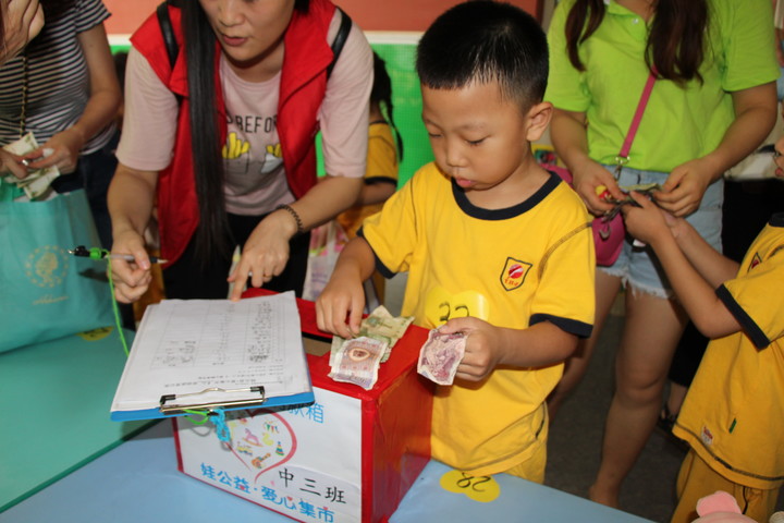 義賣(mài)活動(dòng)結(jié)束后小朋友和家長(zhǎng)共同把義賣(mài)得到的錢(qián)投入到募捐箱內(nèi),并由行政老師清點(diǎn)捐款。
