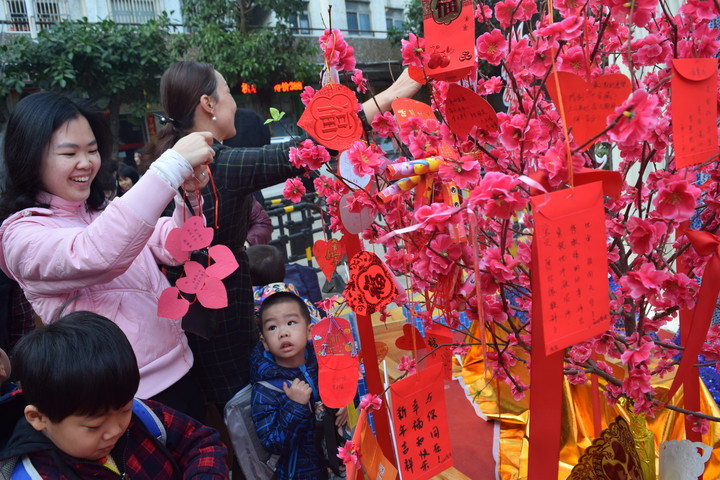 家長和孩子把新年的希望掛在心愿樹上