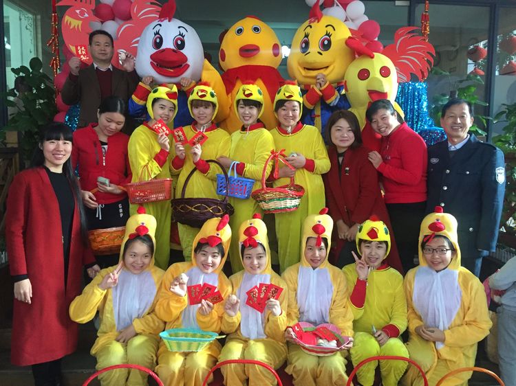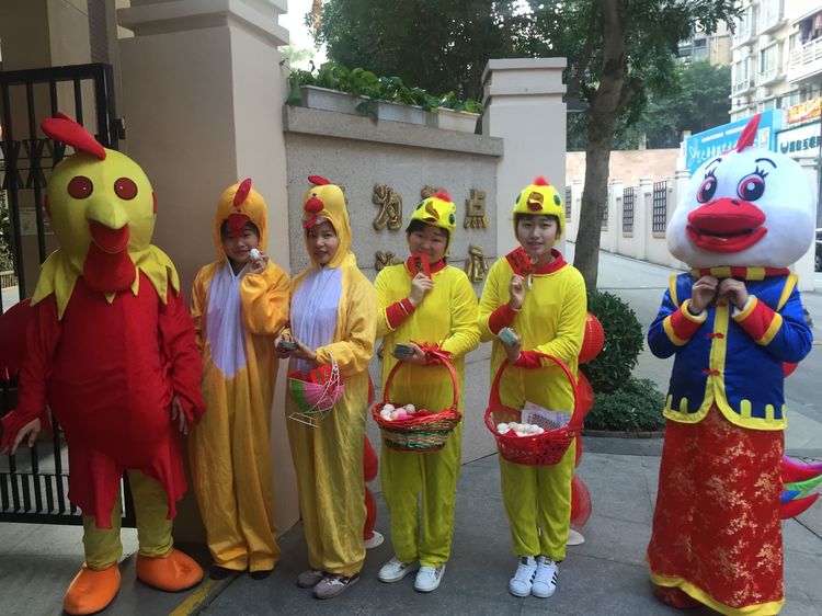老師和爸爸們裝扮成喜氣洋洋的吉祥雞在門口迎接小朋友們的到來!看那一張張洋溢著幸福的笑臉~咱們新的一學期就此開幕!