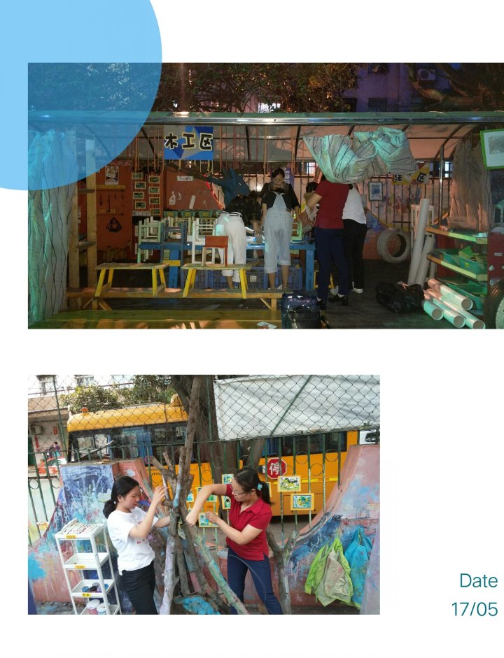 中班級組:承擔(dān)了戶外搭建區(qū)、植物角、手工區(qū)的環(huán)境創(chuàng)設(shè)與材料的投放。教師們也根據(jù)戶外材料與環(huán)境的特點(diǎn),在戶外手工區(qū)的環(huán)境創(chuàng)設(shè)與材料投放中解決了手工材料不易保存和不好進(jìn)行個別指導(dǎo)的情況等問題:在戶外手工區(qū)利用墻面的空間裝設(shè)籃子提供手工材料(雙面膠、膠水、剪刀、水彩筆等),在利用儲物架安放幼兒作品和提供多種手工輔助材料(皺紋紙、卡紙、瓦楞紙、色紙等),并提供小儲物盒安放手工輔助材料(小紙片、紙團(tuán)、亮片等進(jìn)行粘貼)。