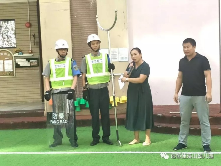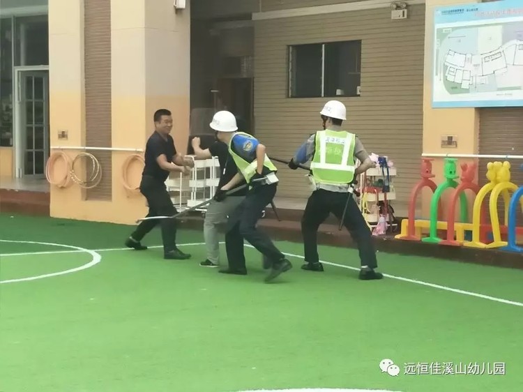 同時,幼兒園應急小組緊急行動,按防暴應急預案要求手持棍棒、鋼叉等,將“歹徒”圍住,與“歹徒”交涉、周旋,設法牽制“歹徒”,竭力保護幼兒安全。
