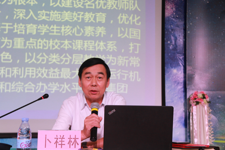 特級(jí)教師、學(xué)校卜祥林校長會(huì)上解讀了新學(xué)年重點(diǎn)工作,明確了新學(xué)年“辦優(yōu)質(zhì)、特色、品牌學(xué)校”的工作目標(biāo),提出了“以立德樹人為根本,以建設(shè)名優(yōu)教師隊(duì)伍為保證,全面貫徹黨的教育方針,深入實(shí)施美好教育,優(yōu)化學(xué)校要素結(jié)構(gòu),完善基于培養(yǎng)學(xué)生核心素養(yǎng),以國際理解教育、藝體教育和創(chuàng)客教育為重點(diǎn)的校本課程體系,打造小班化、個(gè)性化為特色,以分類分層教學(xué)為新常態(tài)的精品課程,健全教育資源配置和利用效益最大化的運(yùn)行機(jī)制和保障機(jī)制,全面提高教育質(zhì)量和綜合辦學(xué)水平,為集團(tuán)20年團(tuán)慶獻(xiàn)禮”的總體工作要求。