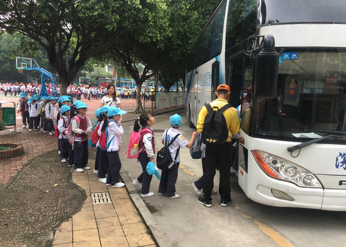 學(xué)生整齊排隊(duì)上車出發(fā)東部華僑城