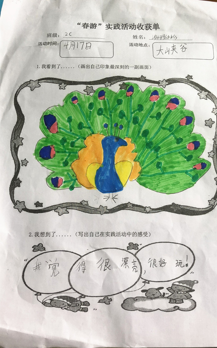古人云:“行萬里路,讀萬卷書”。有所見,有所思,有所記,活動才有真正的意義?;顒咏Y(jié)束后,同學(xué)們通過繪畫和寫作相結(jié)合的形式,把自己的所見、所思、所感記錄下來,并在同學(xué)中進(jìn)行了交流、展示,為本次春游畫上了一個圓滿的句號。