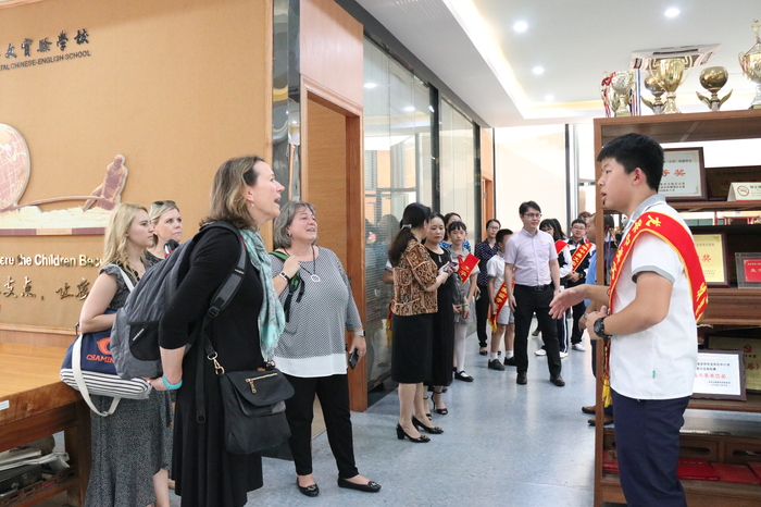 參觀訪問(wèn)代表團(tuán)首先實(shí)地考察了我校高中美術(shù)專(zhuān)業(yè)班、創(chuàng)客實(shí)踐工作室、社會(huì)資源中心、行政服務(wù)中心、圖書(shū)資源中心、小班化精品課堂等場(chǎng)室及學(xué)生學(xué)習(xí)情況,在集團(tuán)及學(xué)校領(lǐng)導(dǎo)的陪同下,小學(xué)、初中、高中學(xué)生代表全程用英語(yǔ)對(duì)美國(guó)客人進(jìn)行了介紹。來(lái)賓對(duì)我校一流的資源配置、學(xué)生良好的學(xué)習(xí)狀態(tài)表示贊賞,紛紛拍照留念。