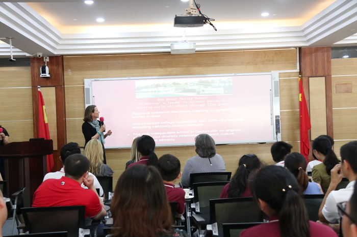 接著在教師培訓(xùn)室舉行了“美國(guó)精英高中學(xué)校見(jiàn)面會(huì)”,集團(tuán)下屬公明中英文及我校家長(zhǎng)、學(xué)生代表近80人參會(huì)。見(jiàn)面會(huì)上,美國(guó)三所學(xué)校代表致辭并介紹了各自的學(xué)校,集團(tuán)國(guó)際交流中心宋騰主任介紹了遠(yuǎn)恒佳國(guó)際教育中心業(yè)務(wù)開(kāi)展情況,參會(huì)家長(zhǎng)、學(xué)生在會(huì)上進(jìn)行了現(xiàn)場(chǎng)交流互動(dòng)。見(jiàn)面會(huì)氣氛融洽,文化交流順暢。