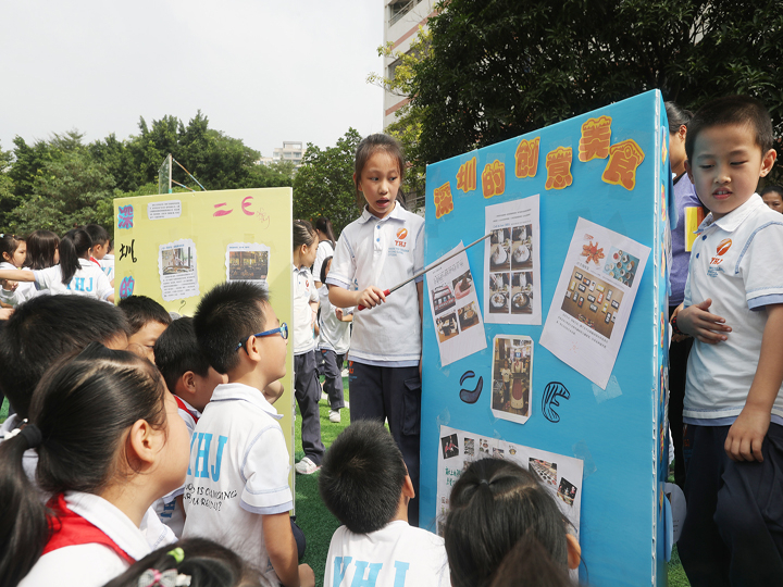 作為一所民辦學(xué)校,公明中英文學(xué)校的外來工子女占到90%之多,為讓孩子們盡快適應(yīng)、喜歡、融入這座城市,本學(xué)期該校選擇了“多彩深圳”這一主題做為主題方案學(xué)習(xí)內(nèi)容。主題確定后,各年級(jí)圍繞該主題再選擇子主題,比如一年級(jí)選擇景點(diǎn)、二年級(jí)選擇美食、三年級(jí)選擇交通、四年級(jí)選擇建筑等,然后各班再根據(jù)年級(jí)主題采用頭腦風(fēng)暴確定展示的內(nèi)容、方式和任務(wù)分工。朋友間交流、向家長(zhǎng)請(qǐng)教,上網(wǎng)絡(luò)查詢,同學(xué)們通過各種方式收集、整理相關(guān)內(nèi)容,并通過手抄報(bào)、繪本的形式制做主題展板?;顒?dòng)當(dāng)天,當(dāng)各班的展板呈現(xiàn)在師生家長(zhǎng)面前時(shí),整個(gè)展區(qū)匯成了一個(gè)五彩斑瀾的知識(shí)海洋?!斑@是深圳的知名企業(yè),騰訊、華為……”,“地王大廈正式名為信興廣場(chǎng)……,創(chuàng)造了世界超高層建筑最“扁”最“瘦”的世界紀(jì)錄”,孩子們?cè)谡刮磺叭鐢?shù)家珍,向師生家長(zhǎng)介紹深圳的各種特色,吸引了大批的參觀者駐足了解。三D班制做的深圳機(jī)場(chǎng)模型,維妙維肖,做工精致,不少家長(zhǎng)拿出手機(jī)拍照留念。而四年級(jí)設(shè)制的有獎(jiǎng)問答,只要答對(duì)問題,便能得到一份現(xiàn)場(chǎng)制做的美食,吸引同學(xué)們排起了兩條長(zhǎng)龍。(文、程?。?span>