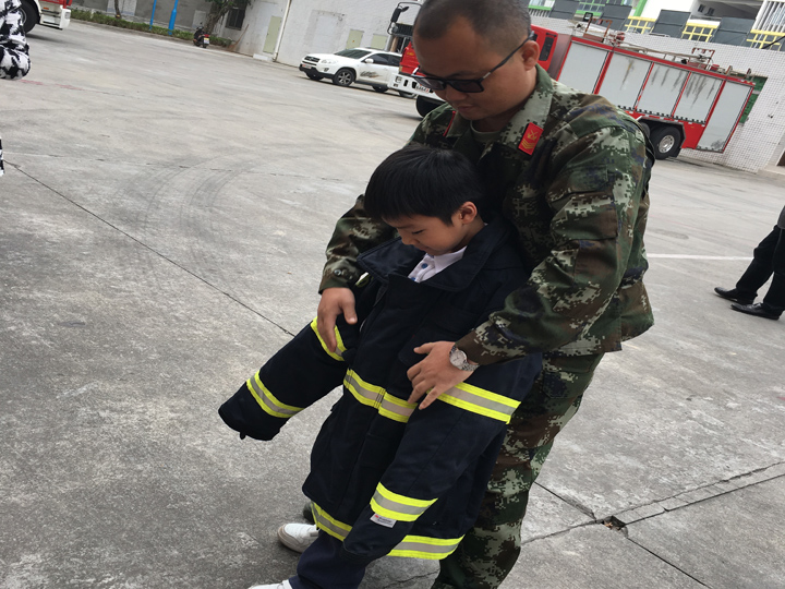 “你們知道消防叔叔為什么厲害嗎?那可要堅持練習哦!”孩子們隨大隊長來到他們練習的地方,剛開始孩子們有些害怕,更多地的是驚喜,在消防叔叔的鼓勵下慢慢都參與各種練習中,學習消防叔叔的堅強和勇敢。