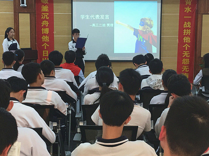 下午5時(shí)許,學(xué)生會主持人梁佳婷同學(xué)宣布會議開始。大會在嘹亮的國歌聲中拉開序幕,全體師生起立,奏唱國歌。首先,高三(2)班的賈理同學(xué)代表全體高三學(xué)生發(fā)言。他說:“少年自有少年狂,藐昆侖,笑呂梁,磨劍十年,今將試鋒芒!如果說之前的十二年是漫長的馬拉松,那么現(xiàn)在,我們已進(jìn)入那最后的沖刺階段。讓我們不負(fù)父母的期盼,不負(fù)恩師的囑托,不負(fù)學(xué)校的厚望,頑強(qiáng)拼搏,全力以赴,鑄就輝煌!”