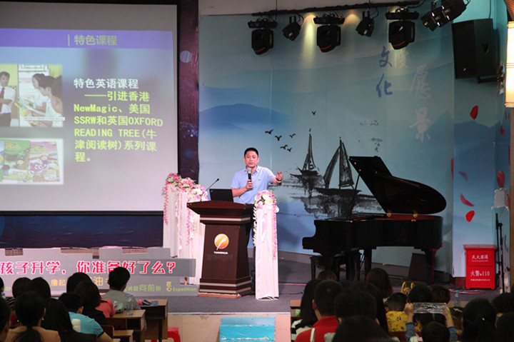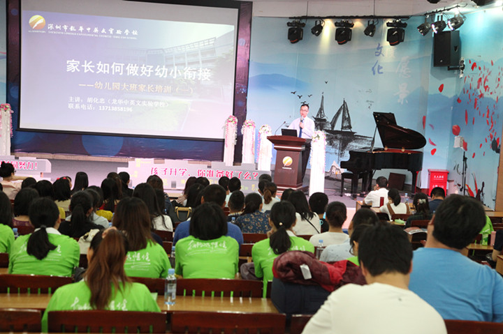 每場(chǎng)次的培訓(xùn)講座分四個(gè)主要環(huán)節(jié):一是長(zhǎng)期工作在小學(xué)教育一線的教育能手作培訓(xùn)講座;二是集團(tuán)學(xué)校建設(shè)管理方面的專家與家長(zhǎng)進(jìn)行幼小銜接經(jīng)驗(yàn)交流;第三個(gè)環(huán)節(jié)穿插在前二個(gè)環(huán)節(jié)中,利用培訓(xùn)講座間隙,由集團(tuán)親子教育導(dǎo)師與幼兒家長(zhǎng)進(jìn)行互動(dòng)。第四個(gè)環(huán)節(jié)是集團(tuán)安排專門人員參觀龍華中英文實(shí)驗(yàn)學(xué)校的校園環(huán)境、小班化、國際化、校園文化等方面的建設(shè)情況。