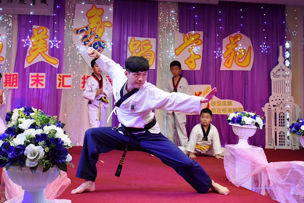 圖為跆拳道戴昂教練與同學(xué)們同臺(tái)演出