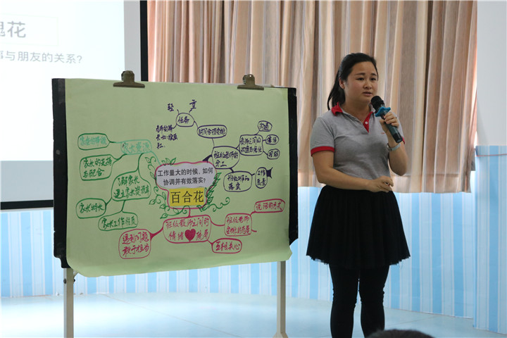 老師們被分成三組研討分析如何處理工作量大、搭檔不穩(wěn)定、如何平衡同事和朋友之間關(guān)系三個問題。老師們積極參與,各抒己見,遷移已有的經(jīng)驗來解決問題。