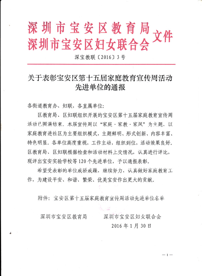 2月29日,深圳市寶安區(qū)教育局、深圳市寶安區(qū)婦女聯(lián)合會、下發(fā)了《關(guān)于表彰寶安區(qū)第十五屆家庭教育宣傳周活動先進(jìn)單位的通報(bào)》(深寶教聯(lián)〔2016〕3號),公布了寶安區(qū)第十五屆家庭教育宣傳周活動先進(jìn)單位名單。我校被授予“寶安區(qū)第十五屆家庭教育宣傳周活動先進(jìn)單位”。