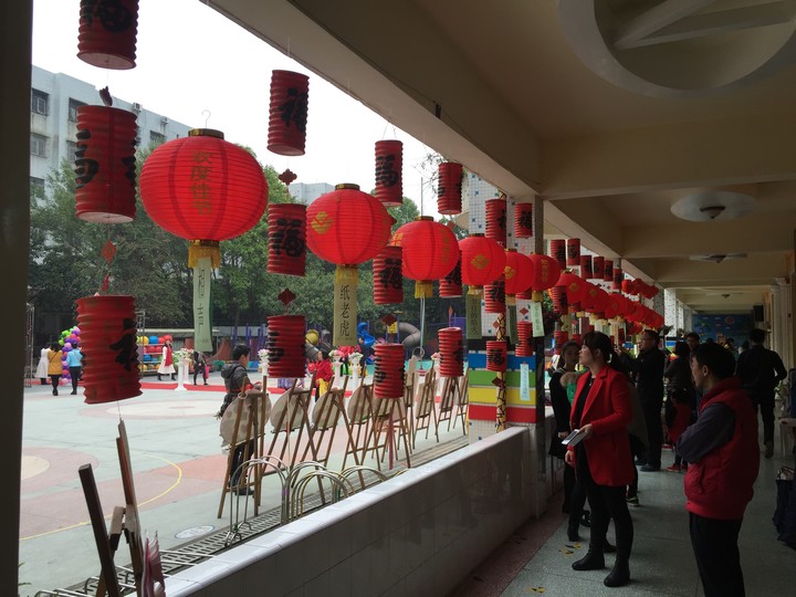 老師和孩子們一起做燈籠過(guò)元宵