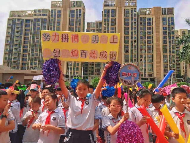 首先是四、五年級(jí)組:“努力拼搏,奮勇向上!百煉成鋼,共創(chuàng)輝煌!”