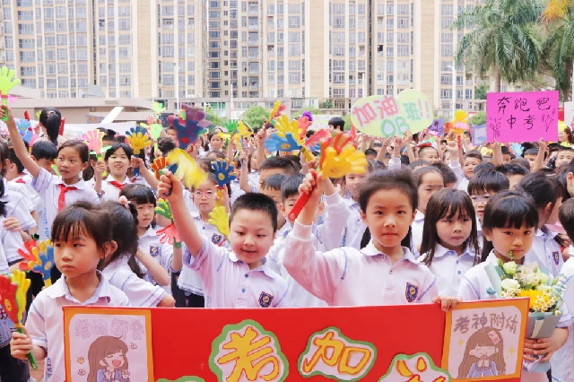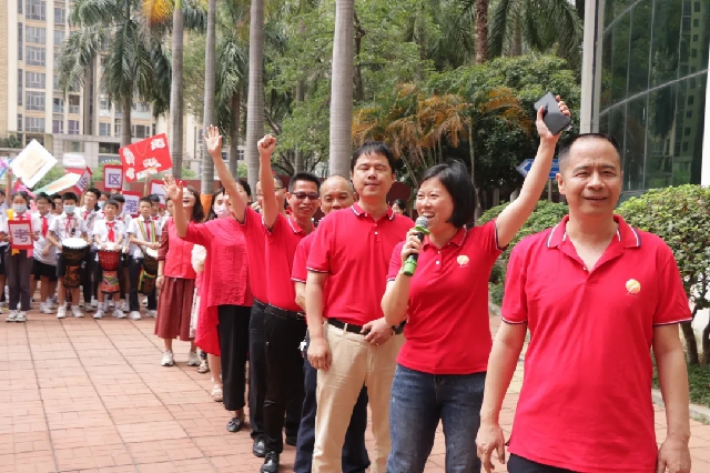 2021年5月6日上午,第二節(jié)課剛一結(jié)束,公明中英文學(xué)校全體師生、家長(zhǎng)代表迅速齊聚小廣場(chǎng)。一瞬間,鑼鼓聲、吶喊聲、歌聲、掌聲震耳欲聾;應(yīng)援板、加油橫幅、張張笑臉映入眼簾,一年一度的中考倒計(jì)時(shí)50天“喊樓”活動(dòng)如期而至!