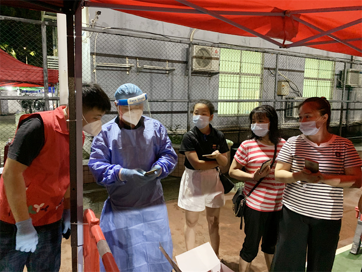 為了協(xié)助龍華區(qū)全員核酸檢測(cè),我校5名志愿者參與了觀瀾大水田社區(qū)的志愿服務(wù)行動(dòng)。大水田社區(qū)離學(xué)校較遠(yuǎn),路況復(fù)雜,我們每天來(lái)回大約需兩個(gè)小時(shí)。我和葉東紅同志主要負(fù)責(zé)檢測(cè)人員分流。本次檢測(cè)人員較多,需10人一組進(jìn)行檢測(cè),有一些老人和小孩兒沒(méi)有健康綠碼,我和葉東紅同志協(xié)助給他們申報(bào)并指引他們到相應(yīng)區(qū)域進(jìn)行檢測(cè)。