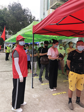 聽(tīng)黨的號(hào)召,為了全員核酸檢測(cè),我校5名志愿者參與了觀瀾大水田社區(qū)抗疫志愿者服務(wù),來(lái)到現(xiàn)場(chǎng)聽(tīng)從安排和培訓(xùn)。3天時(shí)間,我和馬定云同志(少先隊(duì)輔導(dǎo)員)主要負(fù)責(zé)分員分流,檢測(cè)人員較多,需10人1組進(jìn)行檢測(cè),并教他們?nèi)绾翁顖?bào)。志愿者們分工協(xié)作,天氣炎熱,人流多,哪里缺位缺崗有人頂,親身感受到大家的默默付出和無(wú)私奉獻(xiàn)精神,疫情無(wú)情人有情,守得云開(kāi)見(jiàn)月明。大愛(ài)無(wú)疆,戰(zhàn)疫必勝!
