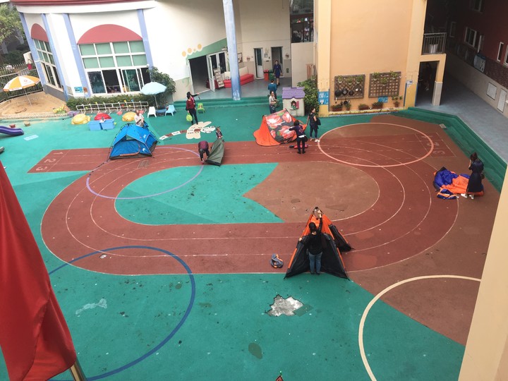 下午4點00分左右,家長們陸陸續(xù)續(xù)帶著自家的帳篷來到幼兒園,迫不及待地開始互相交談如何搭建,如何安置,他們更勝孩子般地期待著今晚親子閱讀的開始。