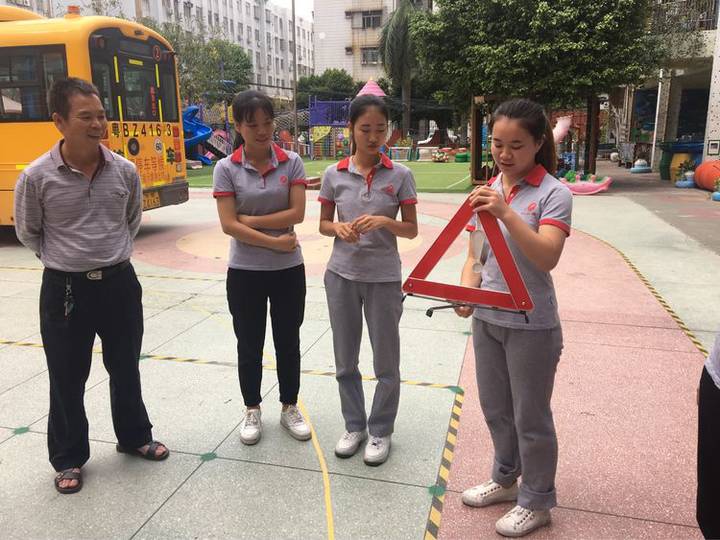 當(dāng)校車著火時(shí),校車司機(jī)立刻打開雙閃警示燈,緊急停車,迅速打開車門及停車示意臂,并在車后50米放警示牌,提示后面車輛繞行,防止二次傷害。與此同時(shí),跟車?yán)蠋熝杆俜€(wěn)定小朋友們情緒,打開后安全門,組織小朋友迅速有序逃離。首先,老師們學(xué)習(xí)如何擺放警示牌,當(dāng)車輛故障需要緊急停車時(shí),記得一定要在車后50米處放置安全警示牌。