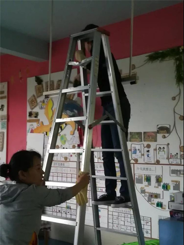 老師和家長一起清潔消毒教室衛(wèi)生。