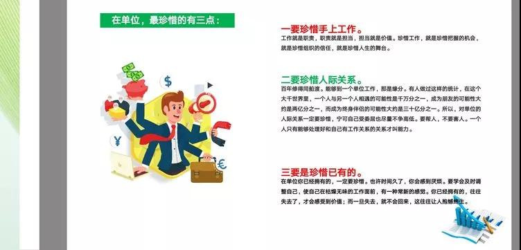 珍惜手上工作,工作就是我們的職責,和擔當;珍惜人際關(guān)系,能夠到一個單位工作,那是緣分。對單位的人際關(guān)系一定要珍惜,一個人只有能夠處理好和自己有工作關(guān)系的關(guān)系才叫能力。三要是珍惜已有的。要學會及時調(diào)整自己,使自己在枯燥無味的工作面前,有一種常新的感覺。