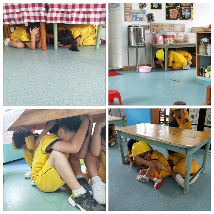 按照老師的指引,藏到桌子底下避險(xiǎn)
