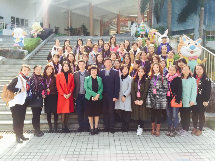 12月30日上午,踏著清晨的露滴,迎著清涼的北風,和暖的冬日陽光一路照射著這群追逐幼教事業(yè)的深圳市學前教育“苗圃工程”骨干教師研修班的全體學員來到東莞!公明二幼教學園長譚偉橙、教學主任陳麗芬也參加了此次培訓班,在深圳大學副院長唐國良教授及楊建老師的帶領下,首先來到了東莞市虎門東方明珠幼兒園實踐觀摩,幼兒園占地面積一萬多平米,環(huán)境優(yōu)美、空間寬敞、芳草茵茵、悅目怡人,以“美化、綠化,教育化、兒童化”為目標,老師們的親切熱情,孩子們天真活潑,讓我們充分感受到園所的文化與特色;戶外體育大循環(huán),把幼兒園的戶外場地運用得淋淋盡致,老師與孩子們在綠草茵茵的草地上走、跑、跳、爬、鉆的體能訓練,讓孩子們真正盡情的擁抱自然,充分感受戶外活動的樂趣,練就強健的體格,老師、孩子們統(tǒng)一的粉色園服融為一體,在運動場地上是一道青春亮麗的風景。