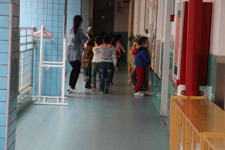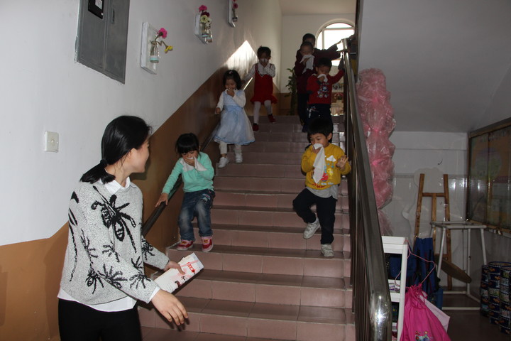 聽到警鈴報警器響后,教師組織幼兒逃離到大操場