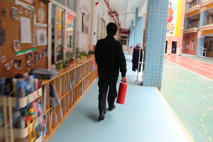 幼兒園保安正在趕往火源發(fā)起點(diǎn)滅火