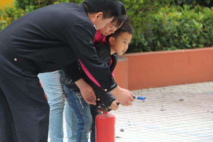 保安叔叔正在示范如何使用滅火器,并且指導(dǎo)教師和幼兒使用滅火器
