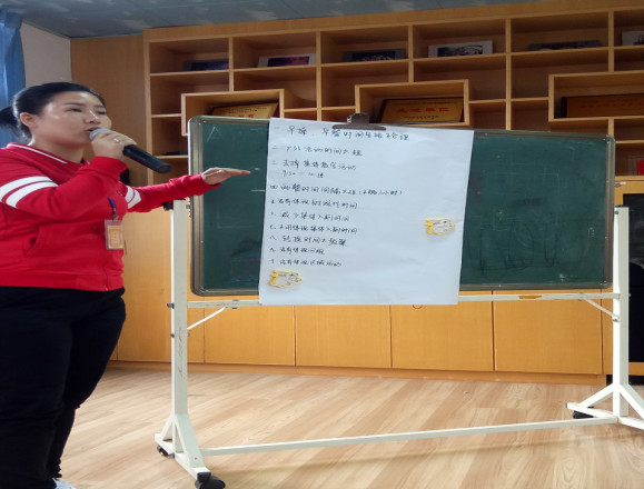 觀看了幼兒的早操后,我們進行分組研討,首先討論了一日生活有哪些類型、我們討論得出有“生活活動、體育活動、自主游戲活動、學(xué)習(xí)活動”。接下來我們組研討的是則是“各幼兒園半日活動安排”,研討后各組進行代表發(fā)言,領(lǐng)導(dǎo)點評。