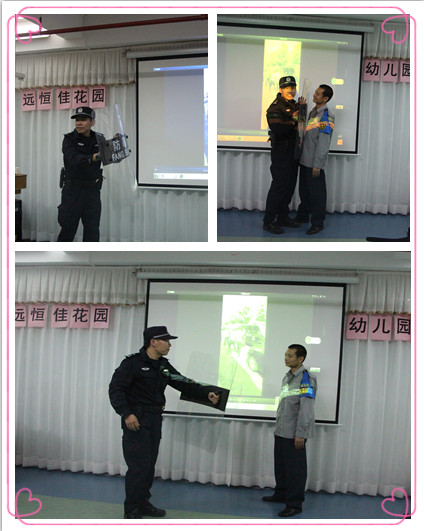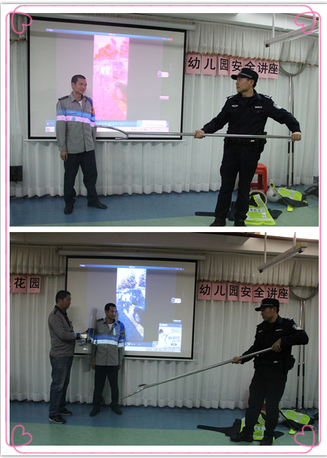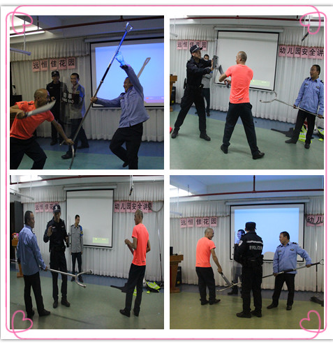 首先,劉教官對(duì)于我們身邊的沃爾瑪恐怖事件、羅湖砍殺事件、寶安區(qū)519等暴力事件進(jìn)行了視頻播放和詳細(xì)分析,不僅讓全體教職員工深切體會(huì)到了暴力事件的可怕性,而且提高提高了教職工的反恐防暴意識(shí)。然后,劉教官分別對(duì)于保安和教師的反恐防暴技巧進(jìn)行了演示指導(dǎo)。例如,讓一名保安扮演暴力嫌疑人,對(duì)鋼叉和防暴盾牌的使用方法進(jìn)行了指導(dǎo)和演示;老師扮演受害者,演示如何進(jìn)行自我保護(hù)。最后,針對(duì)幼兒園的實(shí)際情況對(duì)反恐防暴提出了以下幾點(diǎn)注意事項(xiàng):一、一旦有危險(xiǎn)人物或暴徒闖入,教師不要慌,一定要保持冷靜;二、關(guān)緊門(mén)窗,盡量把孩子與危險(xiǎn)人物隔離開(kāi),將幼兒隱蔽起,避免近距離接觸,引起傷害;三、一定要想辦法拖延時(shí)間,等待救援,盡量避免身體正面接觸,引起不必要的傷亡;四、一旦發(fā)生意外事件,馬上報(bào)警,將傷害降到最低程度。