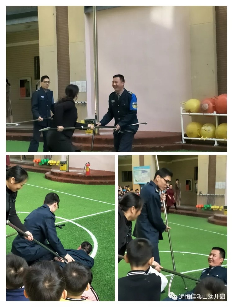 除此之外,安全主任還特別叮囑小朋友們一定要有安全意識,不能輕信陌生人 。有壞人的時候,要大聲呼喊老師,親人。為了讓孩子更加清楚,現(xiàn)場邀請其中一位保衛(wèi)叔叔,扮作“壞人”,過來“抓”小朋友。這時候,安全主任和另一名保衛(wèi)叔叔,拿著鋼叉,馬上趕來,和“壞人”斗智斗勇,成功把“壞人”擒獲。