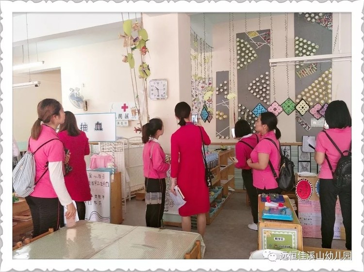 10:00,自主游戲結(jié)束后,觀摩老師們在本園黃美君、毛冬梅、楊慶老師的帶領(lǐng)下,參觀全園環(huán)境。