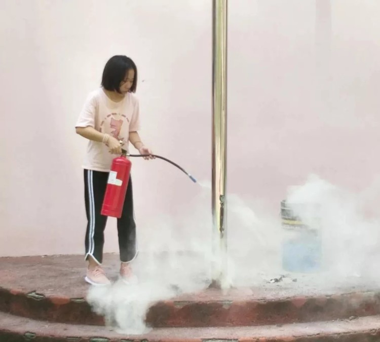 保安叔叔化身“消防員”,演示并詳細(xì)介紹滅火器的使用方法。