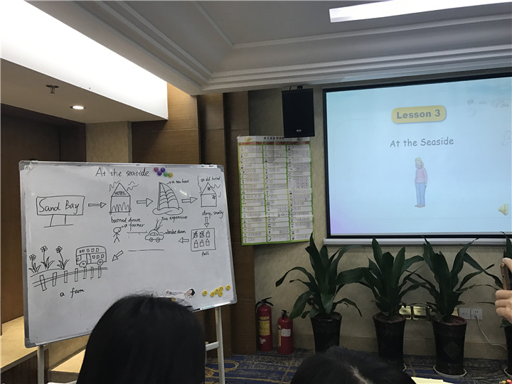 第二天上午的主題是自然拼音教學(xué),是由講師為我們講解自然拼讀教學(xué)的意義、目標、核心原則與方法,同時還展示了課堂實操,讓我們更直觀地理解了自然拼讀法的意義和具體操作方式。在學(xué)習(xí)了上午的理論知識后,下午我們所有學(xué)員分組進行故事教學(xué)設(shè)計與展示,我們被分到了第五組,我們與同組的老師們在很短的時間內(nèi)完成了At the Seaside教學(xué)設(shè)計和講故事的設(shè)計,其中我們的亮點是簡筆畫教學(xué)和分層教學(xué),給現(xiàn)場的老師們留下了深刻的印象。
