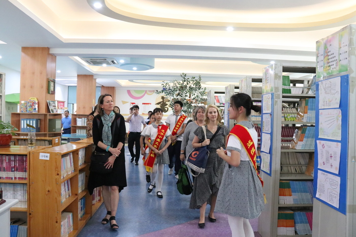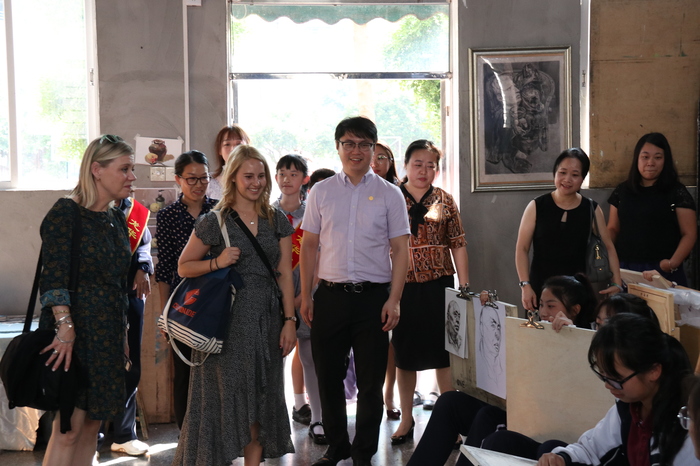 參觀訪問(wèn)代表團(tuán)首先實(shí)地考察了我校高中美術(shù)專(zhuān)業(yè)班、創(chuàng)客實(shí)踐工作室、社會(huì)資源中心、行政服務(wù)中心、圖書(shū)資源中心、小班化精品課堂等場(chǎng)室及學(xué)生學(xué)習(xí)情況,在集團(tuán)及學(xué)校領(lǐng)導(dǎo)的陪同下,小學(xué)、初中、高中學(xué)生代表全程用英語(yǔ)對(duì)美國(guó)客人進(jìn)行了介紹。來(lái)賓對(duì)我校一流的資源配置、學(xué)生良好的學(xué)習(xí)狀態(tài)表示贊賞,紛紛拍照留念。