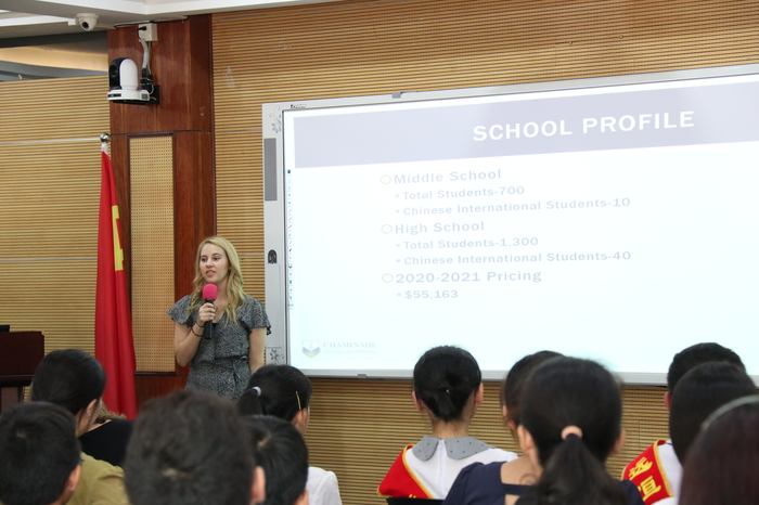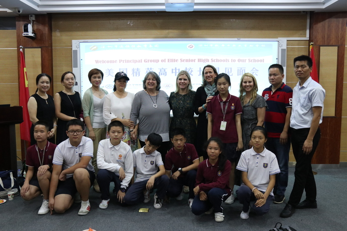 2019年10月18日下午,美國(guó)查米納德大學(xué)預(yù)備學(xué)校,奧爾巴尼學(xué)院,邁阿密山谷學(xué)校三所精英高中代表團(tuán)來(lái)校參觀訪問(wèn),參觀訪問(wèn)團(tuán)有查米納德國(guó)際生負(fù)責(zé)人Brittney,升學(xué)規(guī)劃老師Jennifer,奧爾巴尼學(xué)院招生主任Bramble,邁阿密山谷學(xué)校副校長(zhǎng)Susan,IPERC中國(guó)區(qū)段女士,趙爽、郝淼等七名成員。遠(yuǎn)恒佳教育集團(tuán)副總裁麥麗芬女士帶領(lǐng)遠(yuǎn)恒佳國(guó)際交流中心宋騰主任、學(xué)校金玉善副校長(zhǎng)等集團(tuán)及學(xué)校干部接待了來(lái)訪。