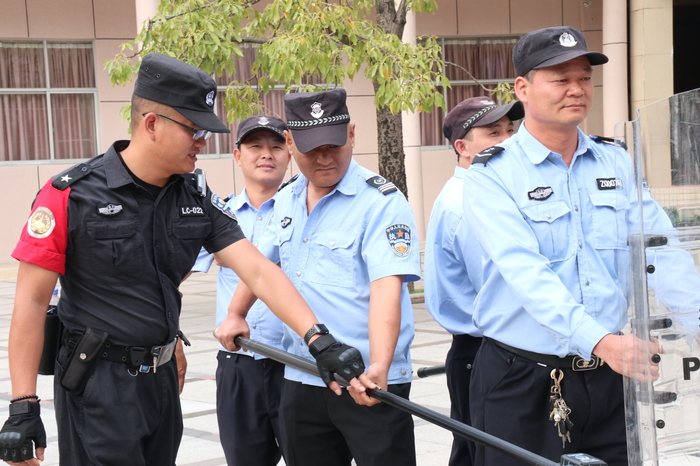實(shí)戰(zhàn)訓(xùn)練中,龍華區(qū)龍城派出所防恐沖鋒隊(duì)隊(duì)員先后就齊眉棍、鋼叉、盾牌等專用反恐防暴器材的使用方法、注意事項(xiàng)及攻防技能進(jìn)行了全面的培訓(xùn),并與學(xué)校安保人員進(jìn)行了六場(chǎng)次的實(shí)戰(zhàn)演練。