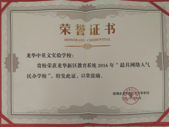 2016年09月,深圳市龍華中英文實驗學校獲評“龍華新區(qū)教育系統(tǒng)2016年最具網(wǎng)絡人氣民辦學?!?,此次上榜的學校全區(qū)僅有三所。