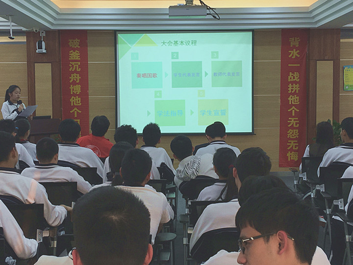 下午5時(shí)許,學(xué)生會主持人梁佳婷同學(xué)宣布會議開始。大會在嘹亮的國歌聲中拉開序幕,全體師生起立,奏唱國歌。首先,高三(2)班的賈理同學(xué)代表全體高三學(xué)生發(fā)言。他說:“少年自有少年狂,藐昆侖,笑呂梁,磨劍十年,今將試鋒芒!如果說之前的十二年是漫長的馬拉松,那么現(xiàn)在,我們已進(jìn)入那最后的沖刺階段。讓我們不負(fù)父母的期盼,不負(fù)恩師的囑托,不負(fù)學(xué)校的厚望,頑強(qiáng)拼搏,全力以赴,鑄就輝煌!”