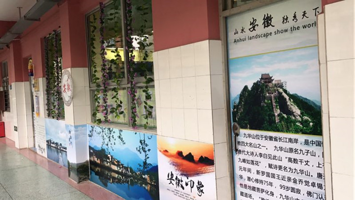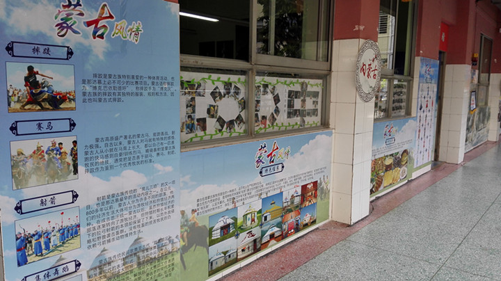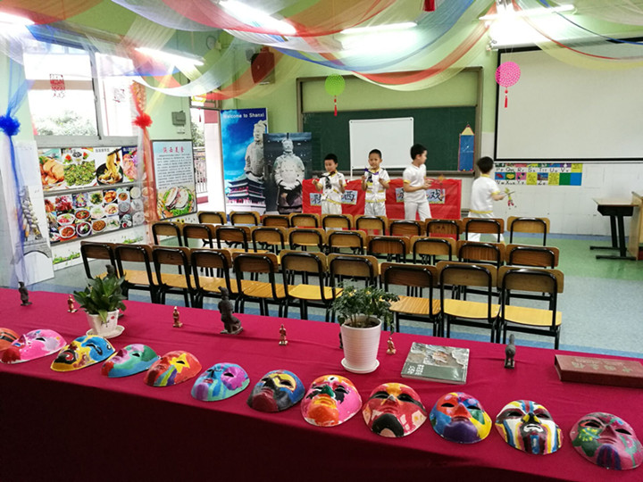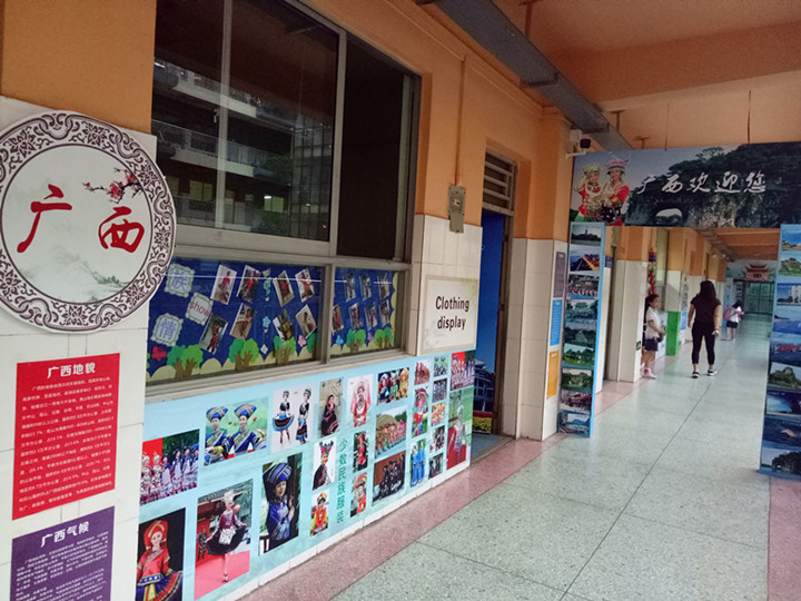 走進(jìn)國際部,到處閃耀著中華傳統(tǒng)文化的光芒,凸顯出國際部的特色教育,學(xué)生耳聞目睹的都是各省優(yōu)秀文化載體:走進(jìn)一樓,最搶眼的是富有節(jié)日氣息的裝飾門,巨幅對(duì)聯(lián)寫著“品鑒中華美食蘊(yùn)養(yǎng)民族大情懷,傳承千古文明拓展學(xué)子寬視野。”走在通往國際部的大道上,映入你眼簾的是一塊塊圖文并茂的國際班各班飲食文化和風(fēng)土人情展版,彌漫著書香翰墨,散發(fā)著文化節(jié)的獨(dú)特魅力,濃縮了各位正副班主任的智慧;走廊、教室上空的彩旗、彩帶、彩蝶迎風(fēng)飄揚(yáng),訴說著美好的辦學(xué)愿景;每個(gè)教室不同的主題和個(gè)性營造了濃濃的中華文化氛圍。