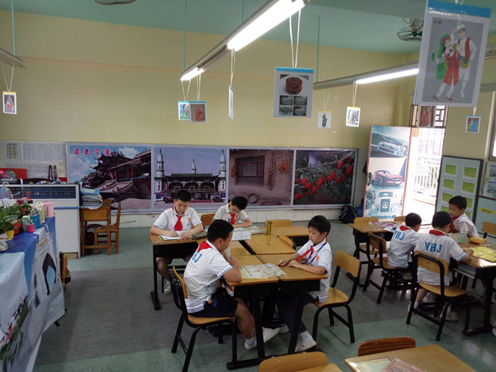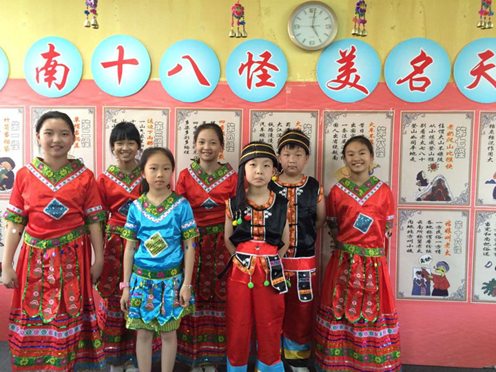 各班級(jí)的地域文化創(chuàng)設(shè)各具特色。3D班以“安徽十大名茶”為主題,以黃梅戲人物手工縮影畫為特色,輔以現(xiàn)場(chǎng)沏茶、彈古箏將安徽文化演繹得古色古香;1B班匠心獨(dú)運(yùn),教室內(nèi)的武漢大學(xué)、黃鶴樓、湖北省文化等造型大氣磅礴,賦予教育意義,課桌上整齊擺放的各種古代帆船、戰(zhàn)船重現(xiàn)了赤壁古戰(zhàn)場(chǎng)昔日的輝煌;5A班栩栩如生的“云南十八怪”圖片、惟妙惟肖的各種民族掛飾、服裝、服飾再現(xiàn)了民族風(fēng)情,七彩的懸掛整齊的風(fēng)鈴,微風(fēng)徐來,那悠悠的脆脆的銅鈴聲無不引起我們對(duì)云南昔日商貿(mào)、文化繁榮的遐想……