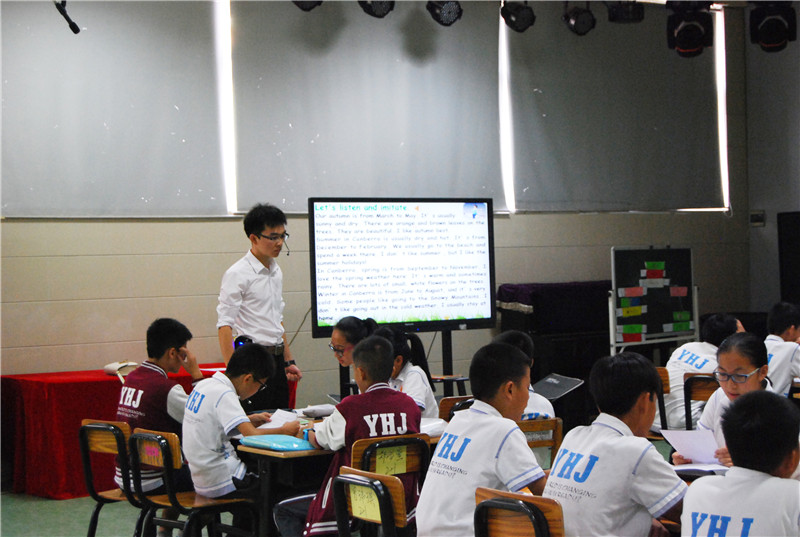 袁老師的課為一節(jié)聽說課,選自七年級上冊Unit 4 The four seasons,課型為Listening and speaking。課上,袁老師用流利的英語與學生交流,可以說師生間全程零困難溝通。袁老師反復讓學生跟讀模仿錄音,及時糾正學生的語音語調(diào)。