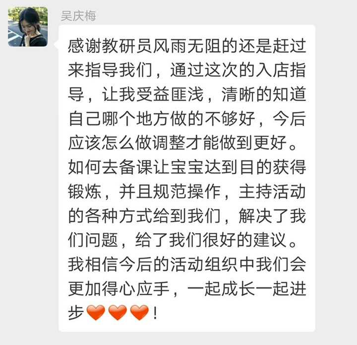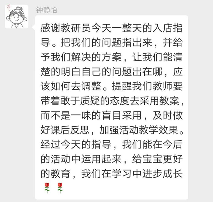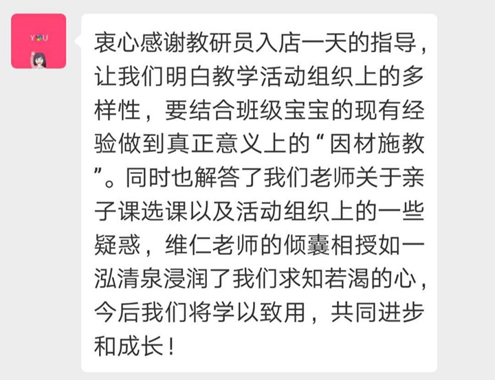 遠恒佳早教以大眾化、家庭化、國際化、品牌化為特色,為服務(wù)社區(qū)大眾的嬰幼兒全方位發(fā)展提供良好的成長條件和環(huán)境,為每一個孩子的美好人生奠基。致力于培養(yǎng)習(xí)慣好、體質(zhì)強、能力優(yōu)的陽光寶貝。做教育,我們不斷研究與時俱進的教育理念,同時秉持集團辦學(xué)宗旨和文化。而支撐一線教育的是集團強有力的專家課程研發(fā)團隊及跟崗一線教研的教研員。2019年4月16日,集團學(xué)前教育管理中心曾維仁教研員親臨中心教研。