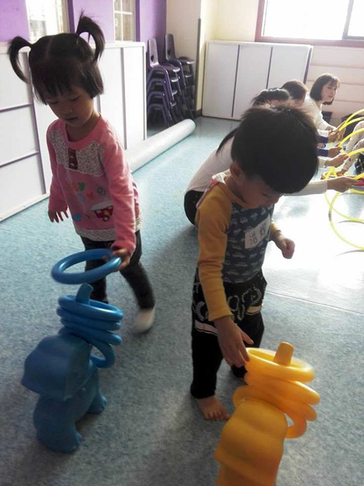 通過(guò)游戲手膝爬和雙腳跳的方式給小象的鼻子套圈,